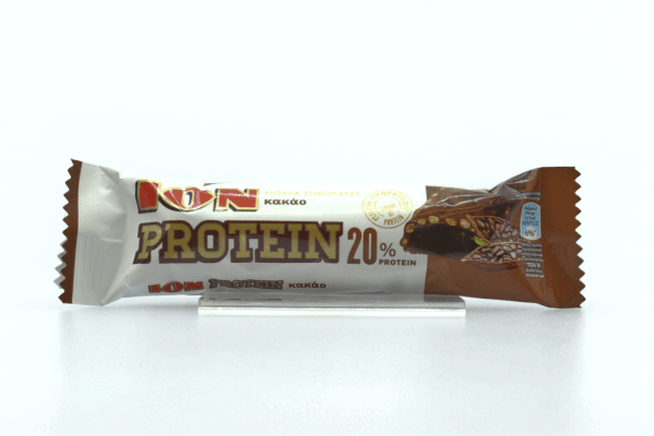 20% πρωτεϊνη! Μια απολαυστική πηγή πρωτεϊνών σε μια μπάρα 50g. από σοκολάτα γάλακτος ΙΟΝ, κακάο και τραγανά crispies.